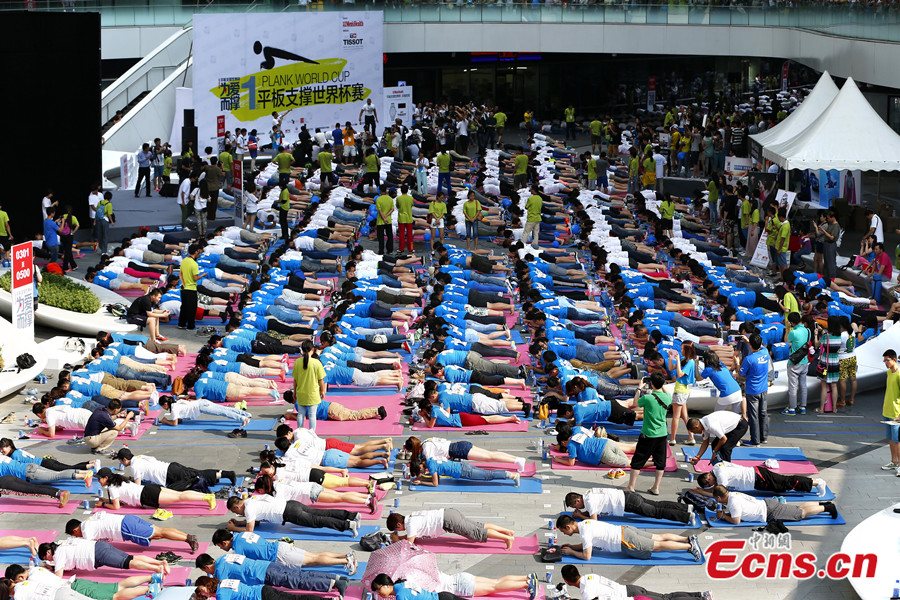 Over 2,000 plank amateurs set up a new Guinness World record with the greatest number of persons doing plank at the same time at Galaxy SOHO in Beijing on June 22, 2014. Chairman of SOHO China Pan Shiyi, "Yoga Godness" Mu Qi Miya and former US Ambassador to China Gary Locke participated in Sunday's event. [Photo: China News Service] |