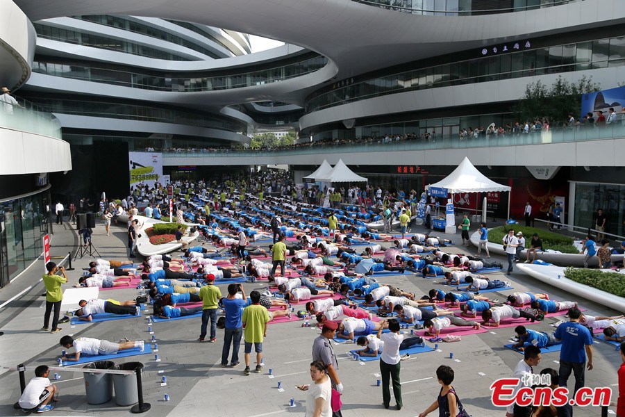 Over 2,000 plank amateurs set up a new Guinness World record with the greatest number of persons doing plank at the same time at Galaxy SOHO in Beijing on June 22, 2014. Chairman of SOHO China Pan Shiyi, "Yoga Godness" Mu Qi Miya and former US Ambassador to China Gary Locke participated in Sunday's event. [Photo: China News Service]
