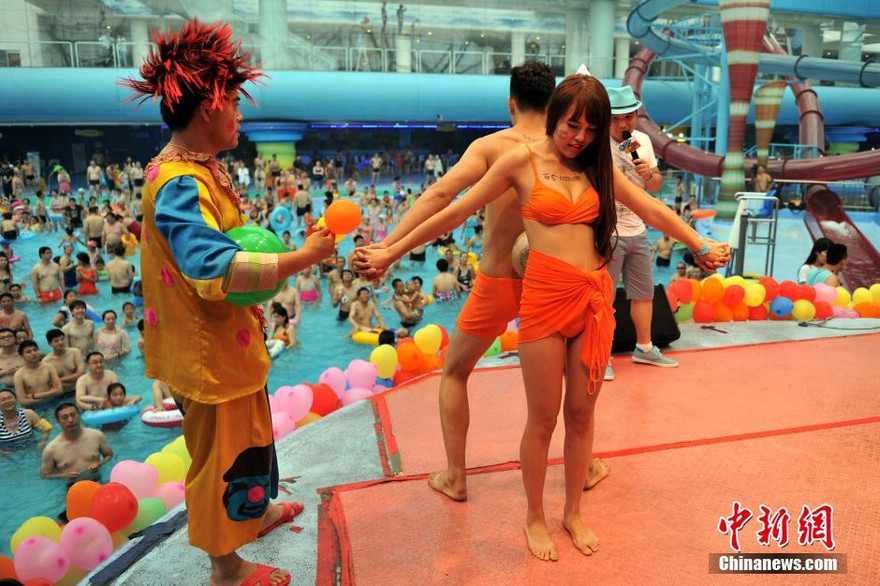 More than 200 singles attended a special blind date, in which participants are required to wear only bikinis and shorts, at Beijing's famous Water Cube, or National Aquatics Center, on the "Qixi" festival, also known as the Chinese Valentine's Day, on August 2, 2014. [Photo from Chinanews.com] |