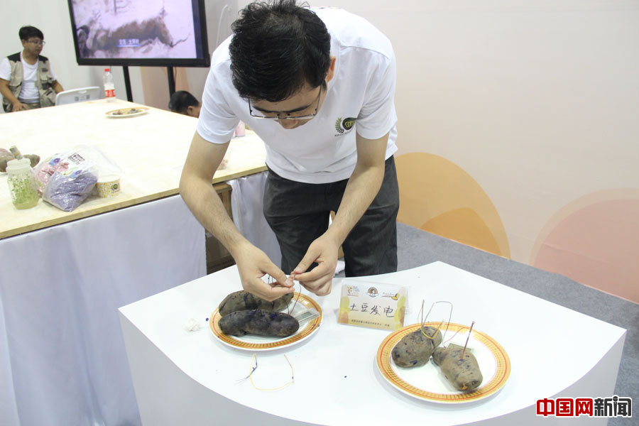 A visitor uses potatoes to generate electricity. [Photo by Zhang Yanling/ China.org.cn]