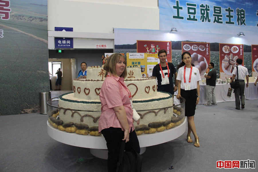 Visitors take a photo in front of a huge potato cake. [Photo by Zhang Yanling/ China.org.cn]
