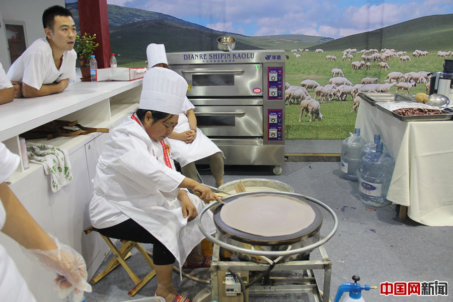 A cook makes a potato pancake. [Photo by Zhang Yanling/ China.org.cn]