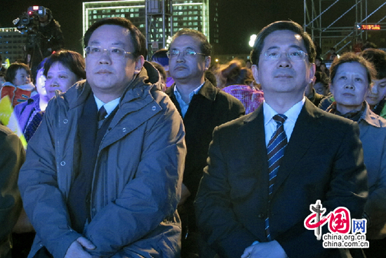 平谷区委书记张吉福(右)、区委副书记、代区长姜帆(左)观看开幕式文艺演出 中国网李志健摄