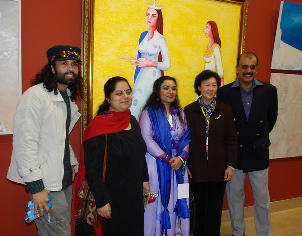 巴拉特(左一)、丽金(中)同印度驻华使馆官员在丽金的作品展上合影。(图片:中国网)
