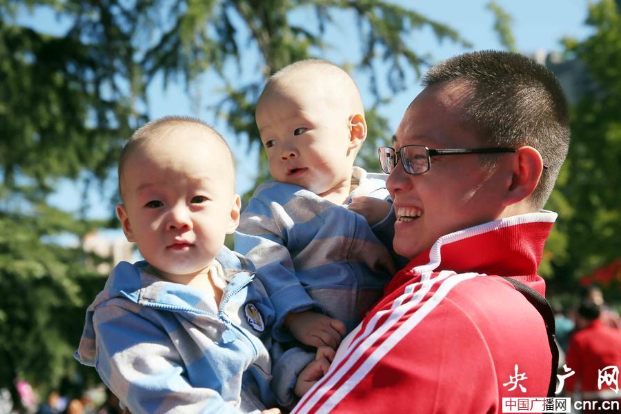 2013年10月2日,在北京双胞胎文化节上,一位家长抱着双胞胎参加活动。(央广网发 陈晓根 摄)