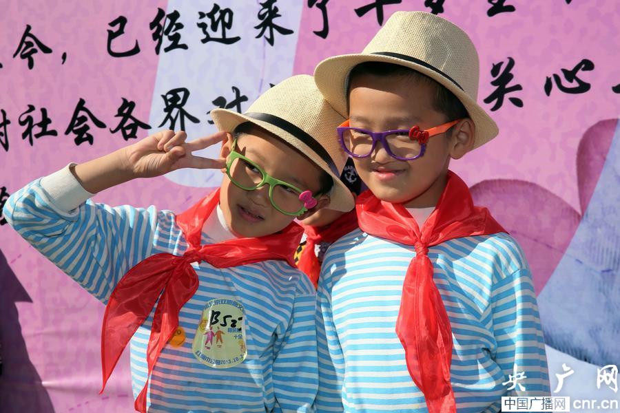 2013年10月2日,在北京双胞胎文化节上,一对双胞胎摆POSE拍照。(央广网发 陈晓根 摄)