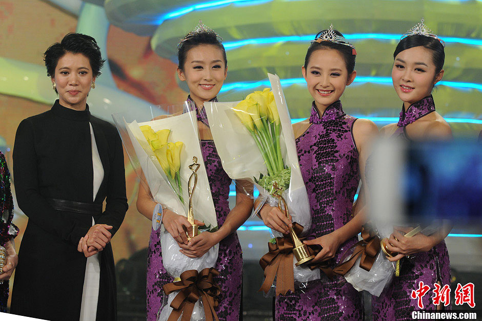 10月26日晚,“2013中华小姐环球大赛”总决赛在珠海举行。来自世界各地的12位中华小姐佳丽展开角逐。最终由年仅21岁来自北京就读于中国传媒大学的王瑾瑶夺得桂冠和最佳上镜奖,来自美国的牟冠红获得亚军,来自云南的曾越获得季军。图为袁咏仪与三甲合影。中新网记者周维 摄
