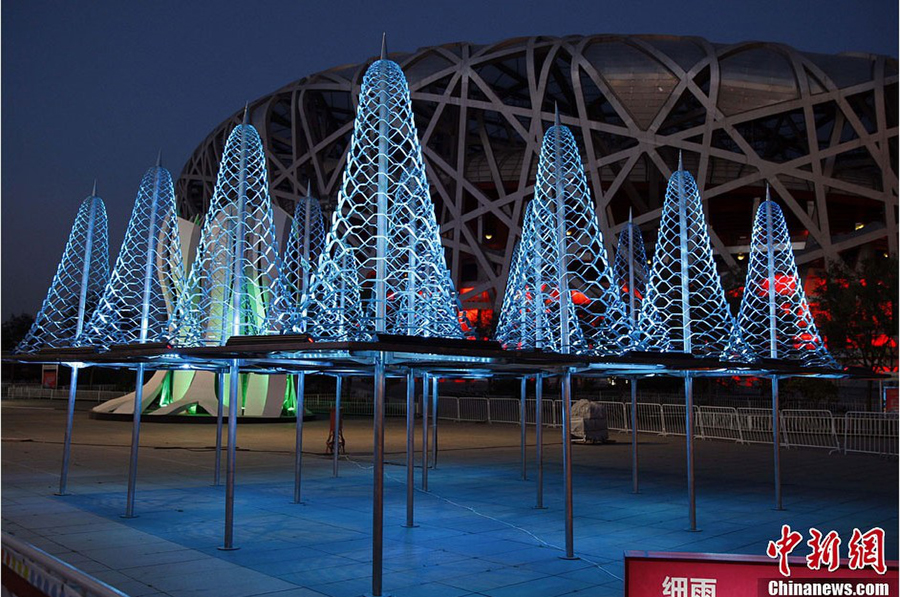 10月下旬,2013年第五届中国国际建筑艺术双年展建造的11件大型公共艺术作品正在北京鸟巢展出。这些作品包括有普林兹策建筑大奖获得者扎哈、赫尔佐格和德梅隆、王澍及哈佛大学设计研究院院长莫森等经典新作。这是中国首次举行的最大规模公共艺术展示。此次建筑文化创意展示主题为“美丽中国--我的城市,我的家”,是一次高质量的城市广场公共空间艺术活动。图为作品--细雨。中新社发任海霞 摄