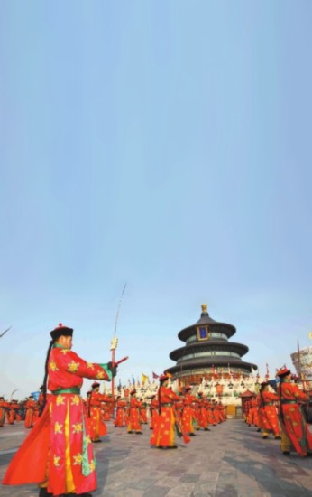天坛祭天仪仗、祭天乐舞表演在正月初一至初五的上午和下午各举行两场。为“节俭办庙会”,今年祭天表演首次缩减人员,由去年的320人减少到260人,总体费用也同比减少10%至20%。