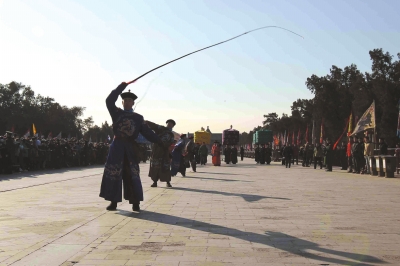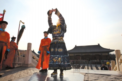 天坛斋宫门前,旗罗伞盖猎猎飘展,刀枪剑戟熠熠生辉,“文武百官”和“八旗武士”依次列阵完毕。9点30分,随着罡筒发出低沉、浑厚的长鸣,由天坛职工扮演的皇帝身穿龙袍从斋宫内缓缓走出,在接受文武百官行跪拜礼之后,移步上轿。一场庄严盛大的祭天仪仗表演拉开大幕。
