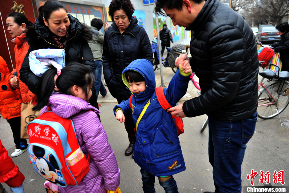 据交管部门预计,全市交通将迅速恢复到节前水平,特别是早晚高峰的交通压力将明显增大。根据往年交通指数分析,预计早8点至晚8点半之间全路网最为拥堵,将达到至少4.0以上“轻度拥堵”水平。图为一位家长把孩子送到学校。中新网记者金硕 摄