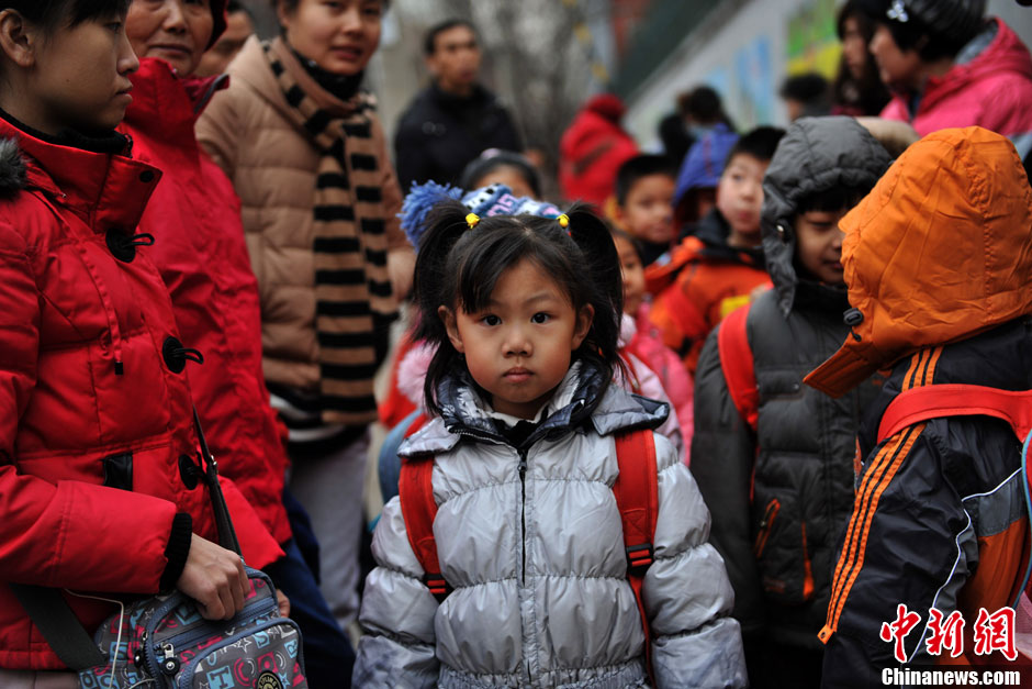 2月17日,北京市中小学开学,接送学生的车流迅速增加,北京交通逐渐告别“节日状态”恢复到节前水平。因此不少送孩子的家长为了避免堵在路上,选择骑自行车、电动车或步行送孩子到学校。图为小学生排队到校报到。中新网记者金硕 摄