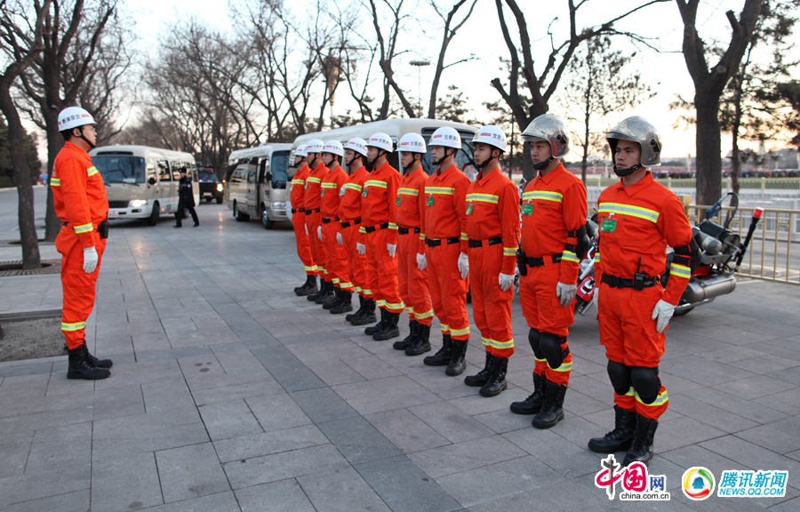 消防器材摆放完后,府右街消防中队指导员张子健给参加本次执勤任务的消防员布置执勤巡逻任务。中国网陈维松 摄