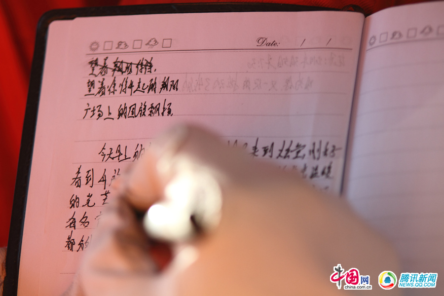 李佳宁在本上写到:“望着徐徐升起的朝阳,广场上的国旗飘扬”。中国网 陈维松 摄