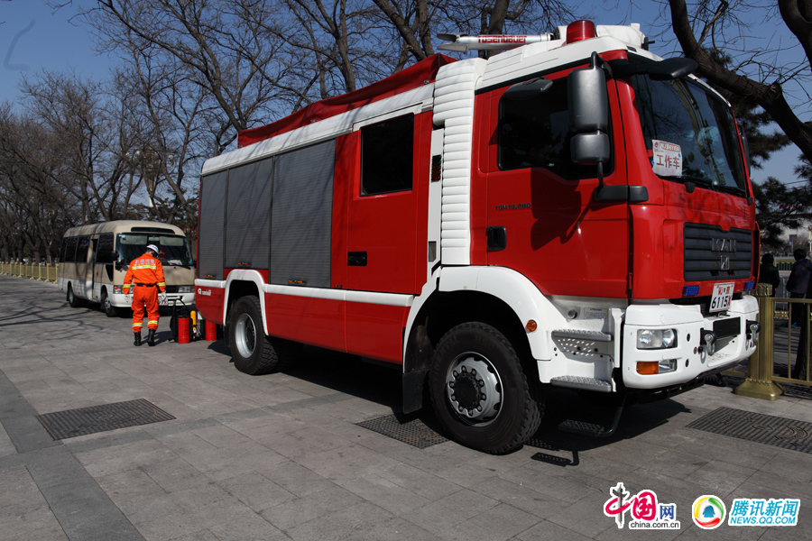 14点,执勤车队再次来到人民大会堂东门外广场执勤点,开始下午的执勤。没有了上午人大开幕会的诸多车辆人员,下午的执勤张丁和李佳宁巡逻了一次。中国网陈维松 摄