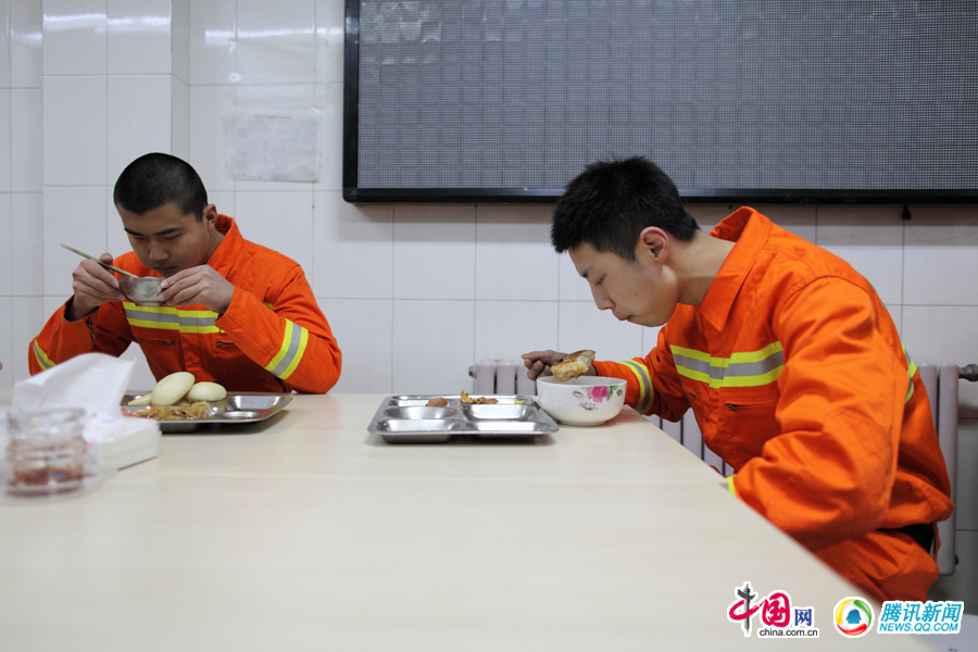 和李佳宁一起吃早饭的是张丁,来自四川乐山。张丁出身于1994年,2012年入伍。今年是李佳宁和张丁第一次承担全国两会消防安保工作,他们将作为一组进行巡逻。中国网陈维松 摄