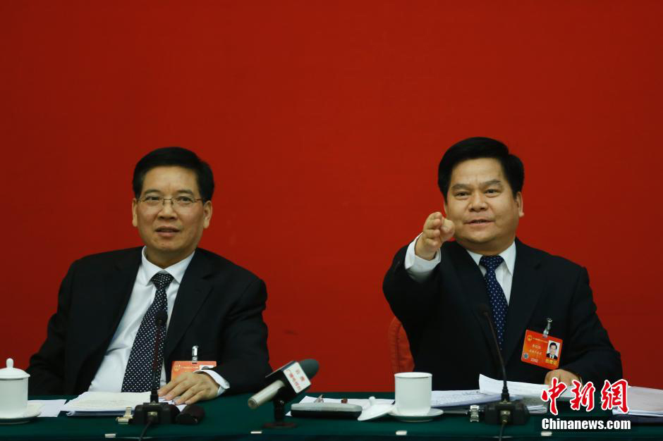 3月9日,云南省委书记秦光荣、省长李纪恒回答记者提问。当日,十二届全国人大二次会议云南代表团全体会议向媒体开放并回答记者提问。中新社发盛佳鹏 摄