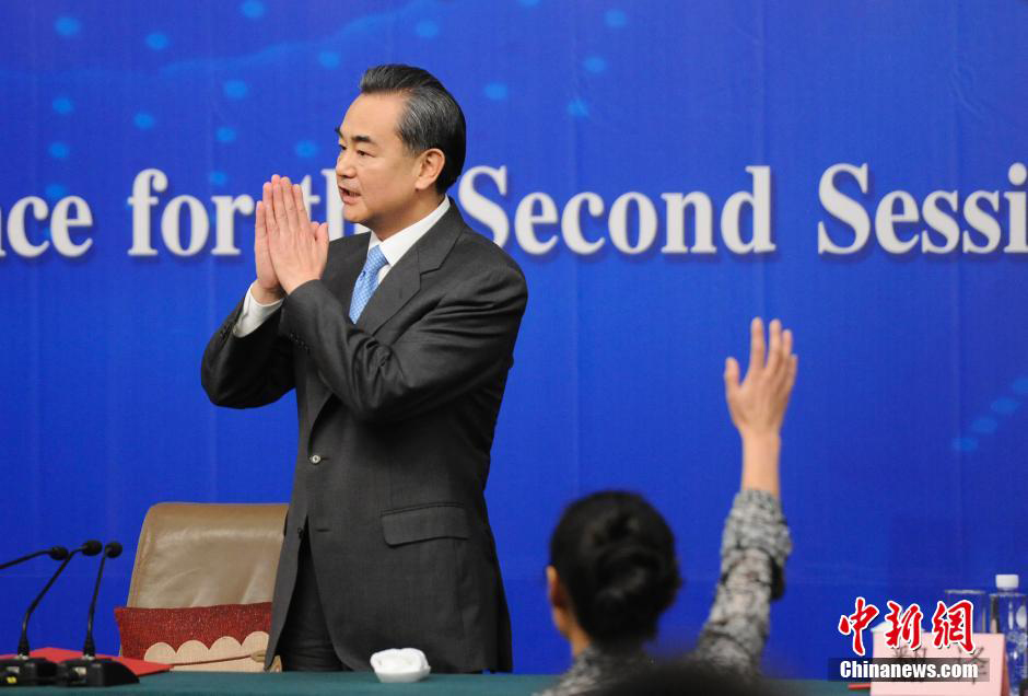 3月8日,十二届全国人大二次会议新闻中心举行记者会,外交部部长王毅应邀就“中国的外交政策和对外关系”的相关问题回答中外记者的提问。会后,王毅合掌向现场中外记者表示感谢。这是王毅首次出席“两会”外长记者会。中新社发侯宇 摄