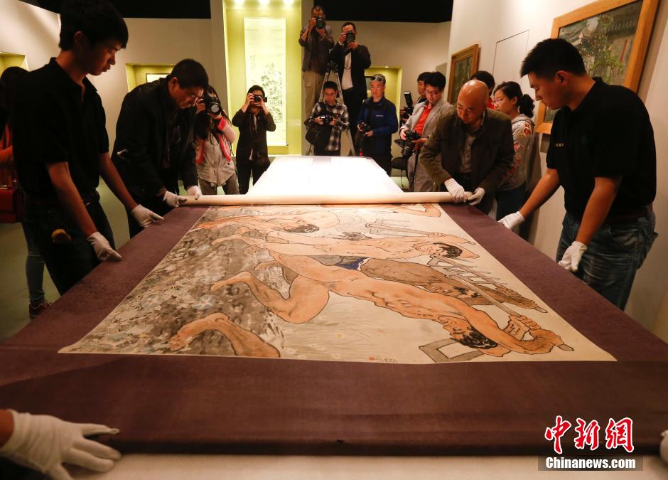 5月5日,“大师与大师——徐悲鸿与法国学院大家作品联展”在中华世纪坛世界艺术馆举行开箱仪式。展出徐悲鸿及法国学院大家们的绘画作品共123件,包括徐悲鸿四位法国老师的代表作品。此次开箱仪式选取了代表中国人物画最高水平的《愚公移山》,这是徐悲鸿在印度期间历时三个月绘制完成的巨作。中新社发杜洋 摄