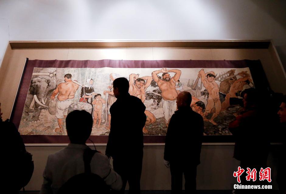 5月5日,“大师与大师——徐悲鸿与法国学院大家作品联展”在中华世纪坛世界艺术馆举行开箱仪式。展出徐悲鸿及法国学院大家们的绘画作品共123件,包括徐悲鸿四位法国老师的代表作品。此次开箱仪式选取了代表中国人物画最高水平的《愚公移山》,这是徐悲鸿在印度期间历时三个月绘制完成的巨作。中新社发杜洋 摄