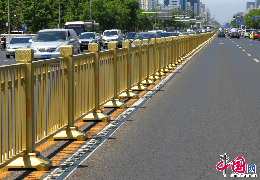 北京东,西长安街的隔离栏换新,闪闪发光的土豪金颜色显得更美观,使“神州第一街”更加壮观了。新的隔离栏进行了防撞设计,比旧的护栏更粗重结实,基本上能够经受得住一般车辆的撞击。中国网图片库 徐经来摄影