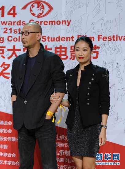 5月10日,管虎(左)、梁静夫妇在北京大学生电影节“明星红毯”活动上亮相。当日,第二十一届北京大学生电影节在北京奥体中心举行闭幕“明星红毯”活动。新华社记者 赵丁喆 摄