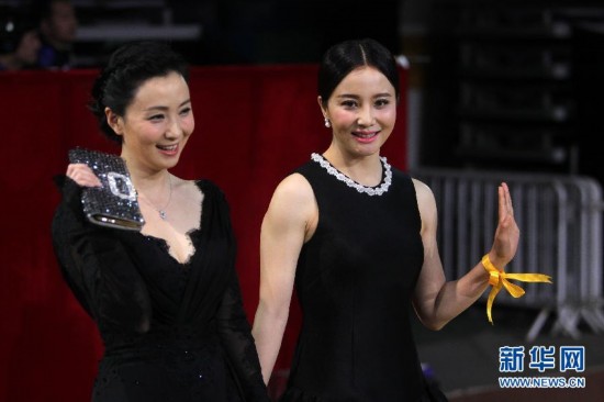 5月10日,陶虹(左)和陶红亮相第21届北京大学生电影节闭幕式红毯。当日,第21届北京大学生电影节闭幕式暨颁奖典礼举行。新华社发(杨乐 摄)