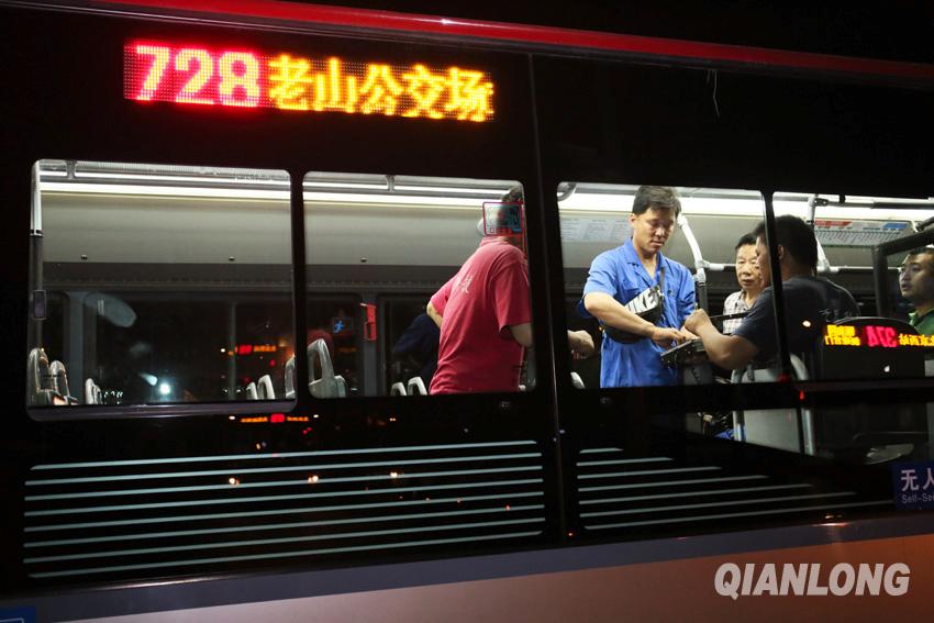 5月25日晚,在728路公交车上,公交公司的师傅们正在更换车辆报站器、计价器新系统,在过一会这辆为市民服务14年的728路公交车将变成特18路,真正的退出历史的舞台。千龙网记者陈康摄