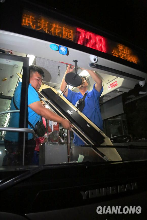 5月25日21点13分,公交公司的工作人员正在更换车头的公交电子屏,师傅说:“没想到会有这么多人关注728” 。千龙网记者陈康摄
