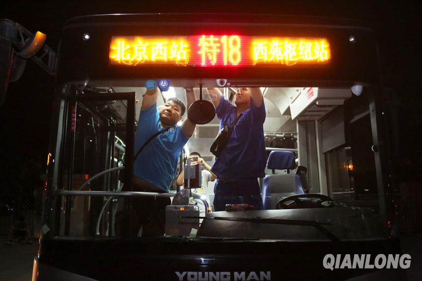25日21点48分,最后一辆728路公交车电子屏更换完成,变成了全新的特18路。千龙网记者 陈康摄