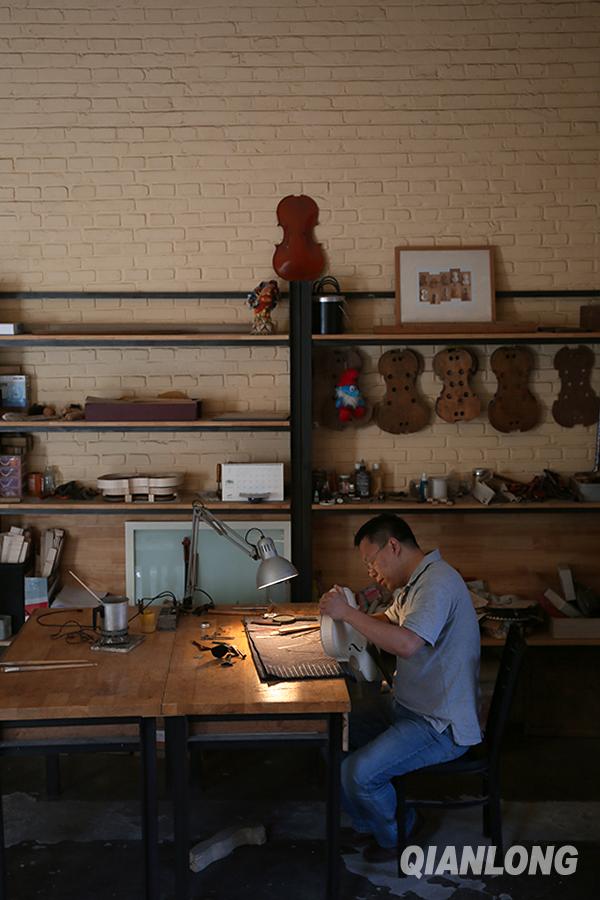 提琴是张安生命中最重要的关键词。每天早上8点钟,张安都会准时到达位于朝阳区的工作室。在这里等待他的是四五个工人和尚未完成的提琴。两个月后,这些木板会变成光洁温润的提琴,变成演奏家手下丝滑延绵的曲调。(2014年5月29日摄)千龙网实习记者于颖摄