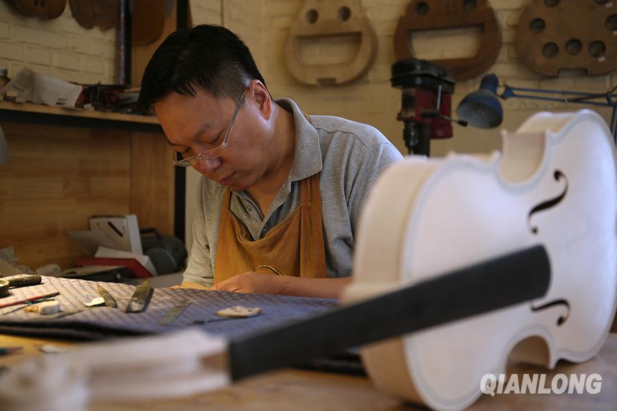 在国外,提琴制作通常是家族薪火相传的行业,作为一个地道的中国人,如何能在这种传统的西方文化中找到自己的表达方式,张安摸索了很久。“东方人制作的提琴都不那么立体,不够饱满,这可能跟我们的血缘与生活环境有关,如何能得到西方体系的认可,这是对制作者的考验。”(2014年5月29日摄)千龙网实习记者于颖摄