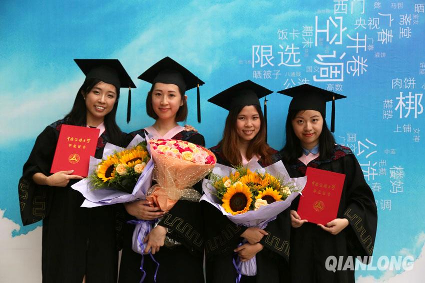 6月25日,中国传媒大学举行2014届本专科毕业生毕业典礼,图为典礼结束后,四名女生在展板海报前合影留念,作别最后的大学生活。千龙网记者王卫摄