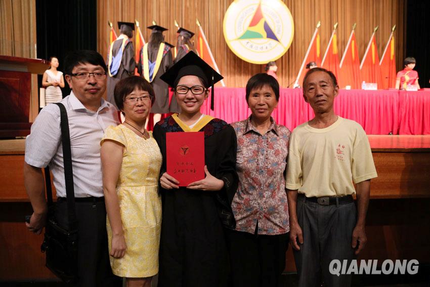 6月25日,中国传媒大学举行2014届本专科毕业生毕业典礼。图为一位毕业生领取毕业证书后,与家人在典礼现场合影留念。千龙网记者王卫摄