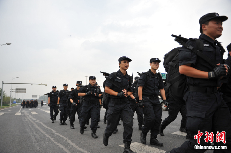 7月24日上午,北京市公安局开展实兵徒步拉动反恐演练。(金硕 摄)