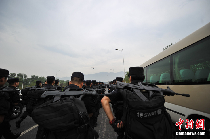 7月24日上午,北京市公安局开展实兵徒步拉动反恐演练。(金硕 摄)