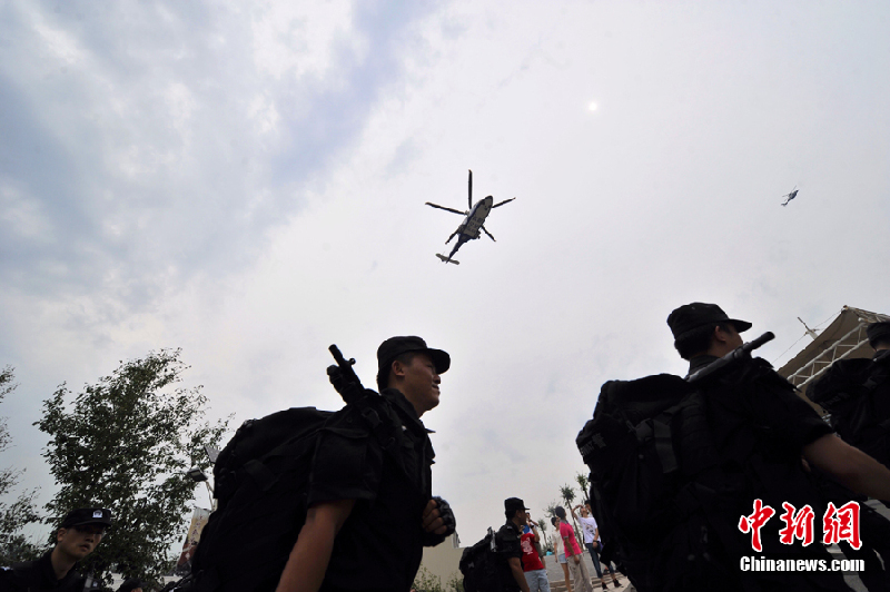 徒步方阵人员从特警总队驻地乘车行至温阳路口下车,携带装备,徒步行至目的地。演练过程中,警用直升机在空中同步跟随队伍行进,沿途承担空中图像传输职责。中新网记者