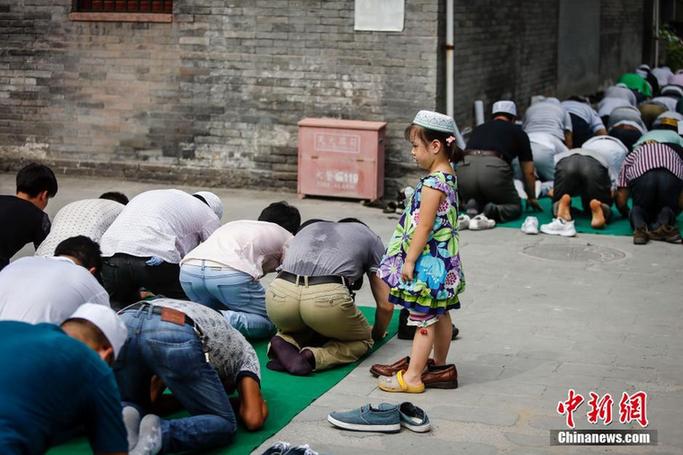 7月29日,北京牛街清真寺举办会礼活动,一名小女孩在仪式上“不知所措”地张望。当日是伊斯兰开斋节,全世界穆斯林纷纷前往清真寺。