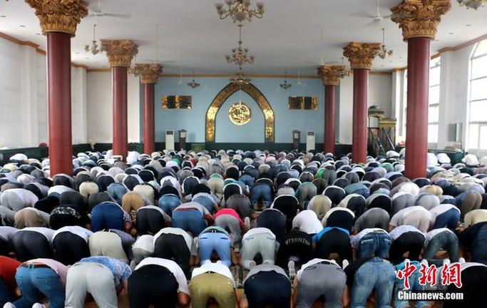 7月29日,穆斯林群众在河北省大厂回族自治县清真寺内进行礼拜。当日是穆斯林的传统节日开斋节,大厂回族自治县穆斯林群众参加会礼、享用美食、走亲访友,欢度开斋节。中新社发刘亮 摄