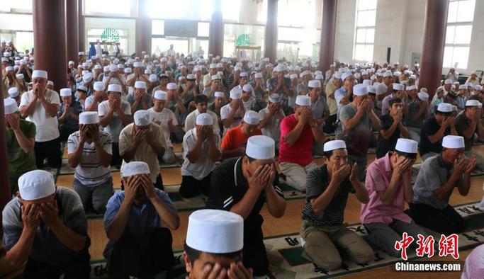 7月29日,穆斯林群众在河北省大厂回族自治县清真寺内进行礼拜。当日是穆斯林的传统节日开斋节,大厂回族自治县穆斯林群众参加会礼、享用美食、走亲访友,欢度开斋节。中新社发刘亮 摄