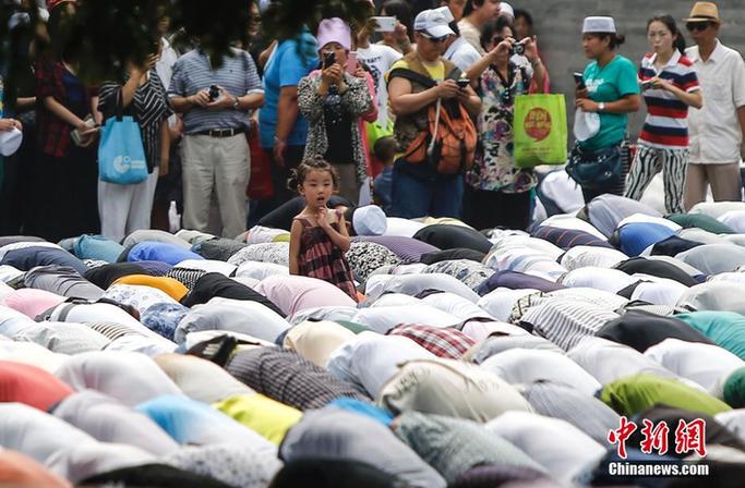7月29日,北京牛街清真寺举办会礼活动,一名小女孩在仪式上“不知所措”地张望。当日是伊斯兰开斋节,全世界穆斯林纷纷前往清真寺。