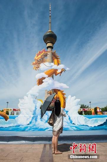 8月6日,一条龙形装置亮相中塔广场,与中央电视塔遥相呼应,引北京市民关注。当日,“穿阅·中塔-2014 3D中国行”大型3D体验展在北京中央电视塔文化广场开幕。据了解,该体验展活动总面积超15000平方米,持续近百天,展出230余项3D艺术作品,是目前中国规模最大的3D体验展。中新社发 崔楠 摄