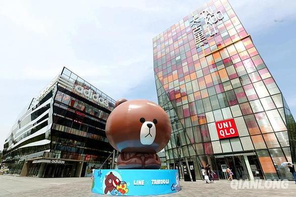 一只巨大的布朗熊蹲坐在朝阳区三里屯某商圈的入口处。千龙网记者 王悦摄