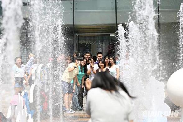 一个女孩正要从喷泉中穿过,她的朋友们激动的等待着。千龙网记者 王悦摄