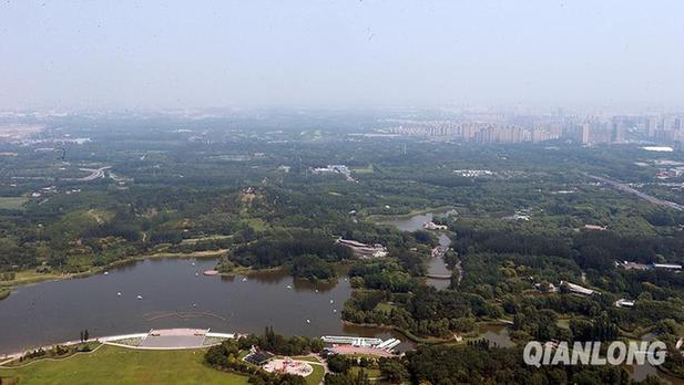 曾被网友称为“大钉子”的北京观光塔即将开门迎客,图为鸟瞰奥森公园中央舞台。(千龙网记者 戚连民摄)