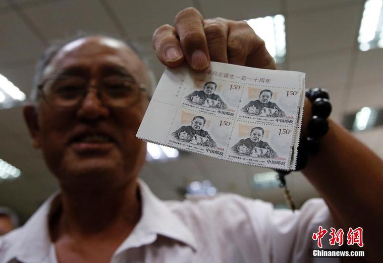 8月22日,正值邓小平同志诞辰110周年纪念日,众多北京市民在北京市南区邮票公司选购纪念邮票,图为一名市民展示抢购到的邮票。中国邮政当日发行《邓小平同志诞生一百一十周年》纪念邮票一套4枚。