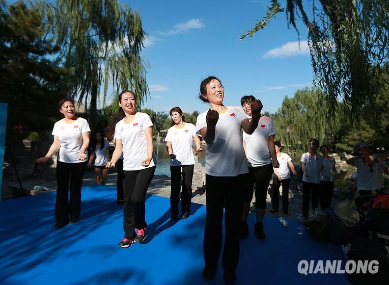 8月24日,大观园内健身爱好者展示健身项目,当日,北京市第九届民族传统体育运动会闭幕。千龙网记者 戚连民摄