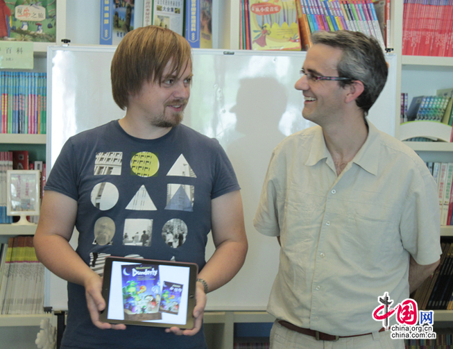 《峻达岭的小怪物》系列丛书的创作者恩德仁•爱瑞克森(右)和插画家恩德仁•思甘迪夫。中国网李珅/摄