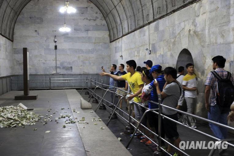 十三陵定陵地宫左配殿内,游客向棺床上投钱。这一棺床建成后并未使用,空旷的样子保存至今。千龙网记者 杨理光摄