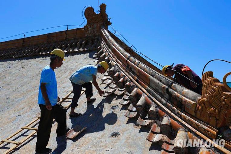 8月26日,工人正在维修十三陵神路大红门的屋顶。千龙网记者杨理光摄